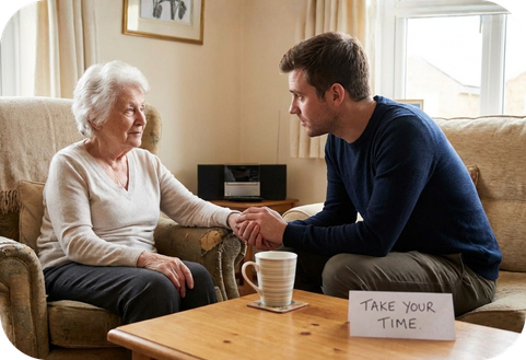 Tone is often understood even when words are not. A calm, gentle voice signals safety. The Alzheimer’s Society emphasizes that a warm tone can reduce confusion and emotional distress, even if the message itself is not fully understood.