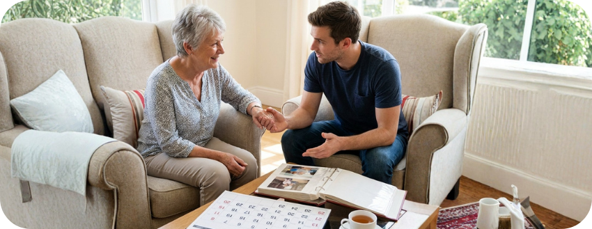Familiar topics feel safe. Long-term memories often remain intact longer than short-term ones. Research in Aging & Mental Health confirms that reminiscence-based conversation improves mood and communication in seniors with Alzheimer’s (ScienceDirect.com).